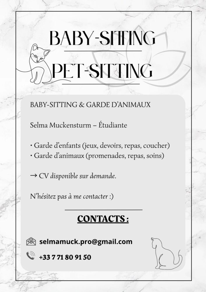 Côté animaux, j’ai moi-même un chien, ce qui me permet d’être à l’aise avec les animaux et de bien comprendre leurs besoins. Je peux assurer les promenades, les repas et les soins de base avec attention.